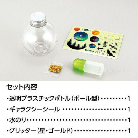 セット内容プラスチックボトル(ボール型)×1、ギャラクシーシール×1、水のり×1、ホログラムグリッター星(ゴールド)×1