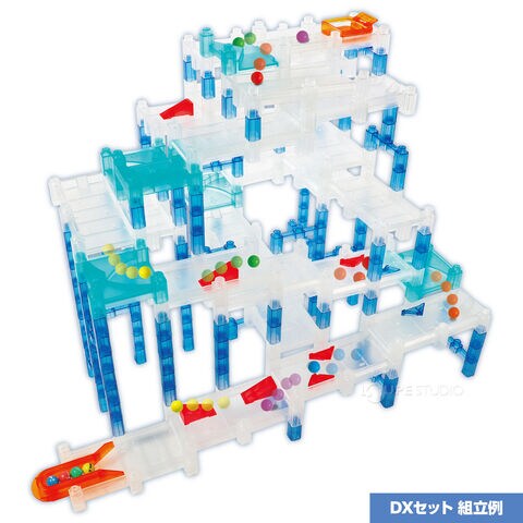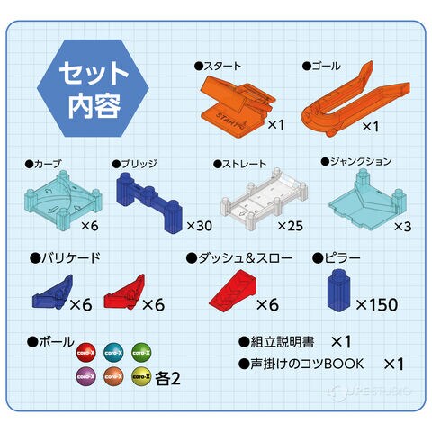 | セット内容 | スタート×1、ゴール×1、カーブ×6、ブリッジ×30、ストレート×25、バリケード×12(赤・青各6)、ダッシュ&スロー×6、ピラー×150、ボール×12、ジャンクション×3、組立説明書×1、声掛けのコツBOOK×1 |