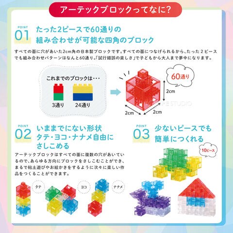 【「アーテックブロック」とは】日本で生まれた新しいブロックです。世界25か国、全国4,000か所以上の幼稚園、保育園に採用!2014年にはグッド・トイ賞にも選ばれた安心の日本製ブロックです。子供から大人までずーっと遊べます。すべての面に穴があいた独自構造のブロック。全方向への連結が可能で、小さいお子さまでも、想像した形をどんどん形にしていけます。子供から大人まで、さまざまな遊び方ができる楽しいブロックです。