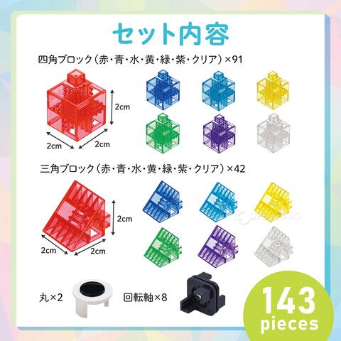 | セット内容 | 全143ピース(四角/赤/青/緑/黄/水/紫/クリア各13コ、三角/赤/青/緑/黄/水/紫/クリア各6コ、目玉パーツ2コ、回転軸8コ) |