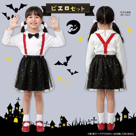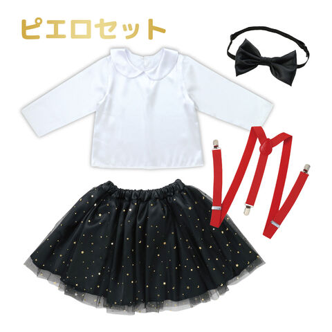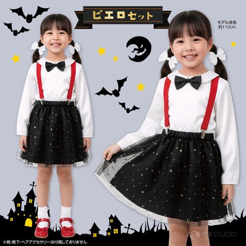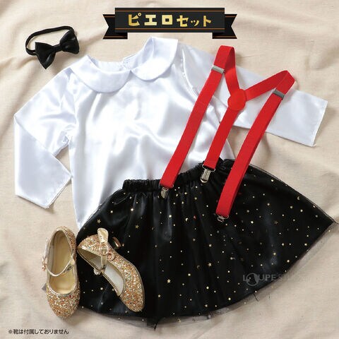 - ブラウス、蝶ネクタイ、スカート、サスペンダーの4点セットで、簡単にかわいく変身できます。