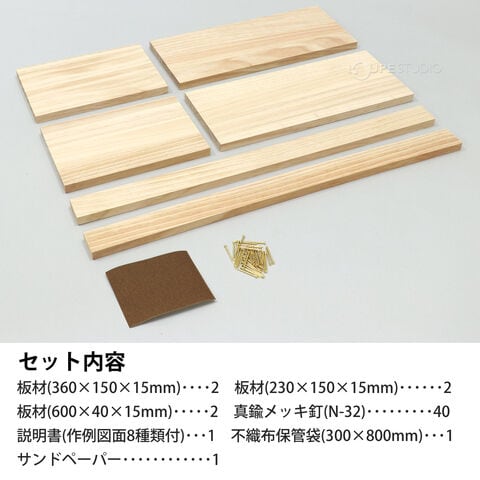 | セット内容 | 板材(360×150×15mm)×2、板材(230×150×15mm)×2、板材(600×40×15mm)×2、真鍮メッキ釘(N-32)×40、説明書(作例図面8種類付)×1、不織布保管袋(300×800mm)×1、サンドペーパー×1 |