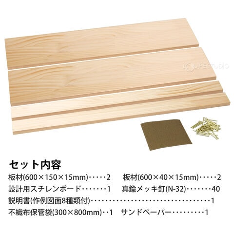 | セット内容 | 板材(600×150×15mm)×2、板材(600×40×15mm)×2、設計用スチレンボード×1、真鍮メッキ釘(N-32)×40、説明書(作例図面8種類付)×1、不織布保管袋(300×800mm)×1、サンドペーパー×1 |