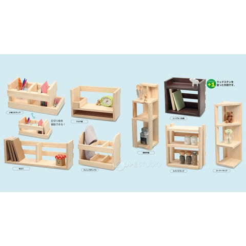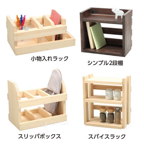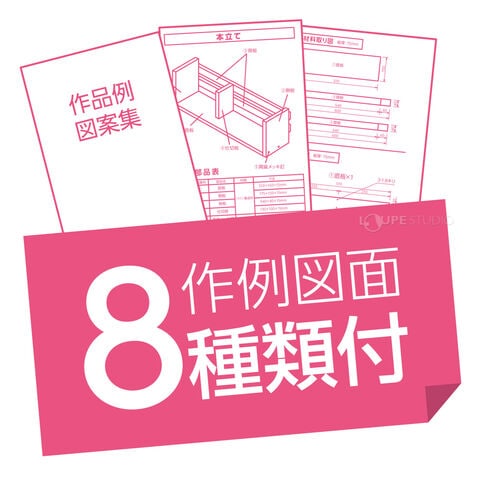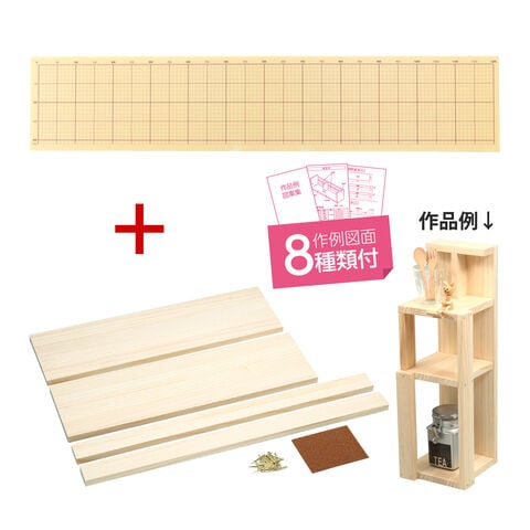 - また、スパイスラックや小物入れ、コーナーラックなど、8種類作品図面と製作工程表が載った説明書付きで、初心者でも手軽にDIYができます。