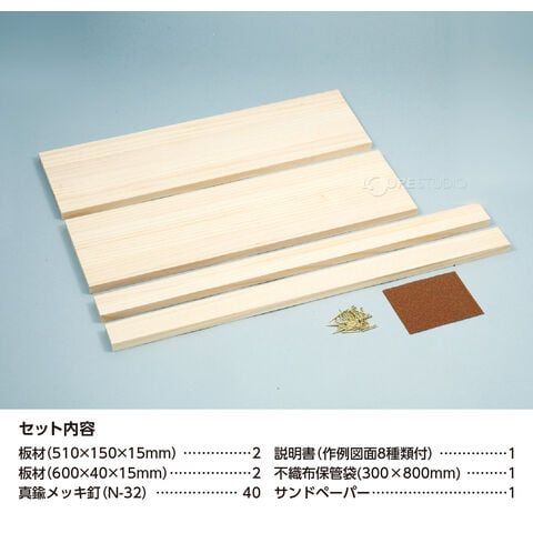 | セット内容 | 板材(510×150×15mm)×2、板材(600×40×15mm)×2、設計用スチレンボード×1、真鍮メッキ釘(N-32)×40、説明書(作例図面8種類付)×1、不織布保管袋(300×800mm)×1、サンドペーパー×1 |