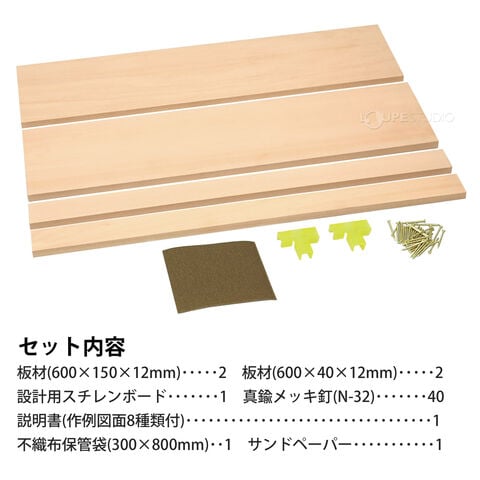 | セット内容 | 板材(600×150×12mm)×2、板材 (600×40×12mm)×2、設計用スチレンボード×1、真鍮メッキ釘(N-32)×40、説明書(作例図面8種類付)×1、不織布保管袋(300×800mm)×1、サンドペーパー×1、 |