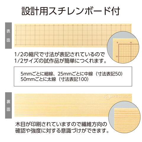 - 組立前の収納物のサイズ確認や設計手順の検証に便利な1/2縮尺の方眼入りの「設計スチレンボード」、木材の保管に便利で丈夫な「不織布保管袋」付きです。