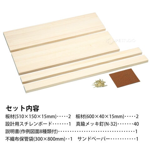 | セット内容 | 板材(510×150×15mm)×2、板材(600×40×15mm)×2、設計用スチレンボード×1、真鍮メッキ釘(N-32)×40、説明書(作例図面8種類付)×1、不織布保管袋(300×800mm)×1、サンドペーパー×1 |