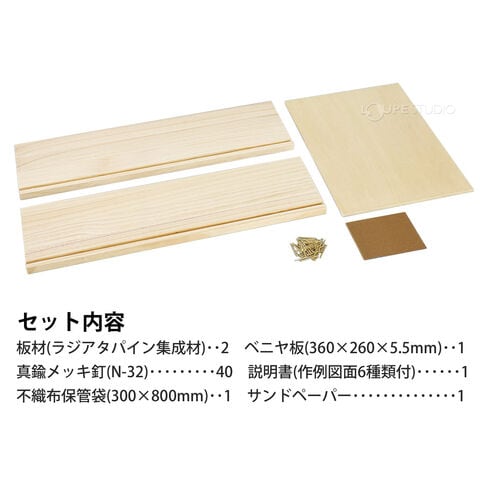 | セット内容 | 板材(ラジアタパイン集成材)×2、ベニヤ板(360×260×5.5mm)×1、真鍮メッキ釘(N-32)×40、説明書(作例図面6種類付)×1、不織布保管袋(300×800mm)×1、サンドペーパー×1 |