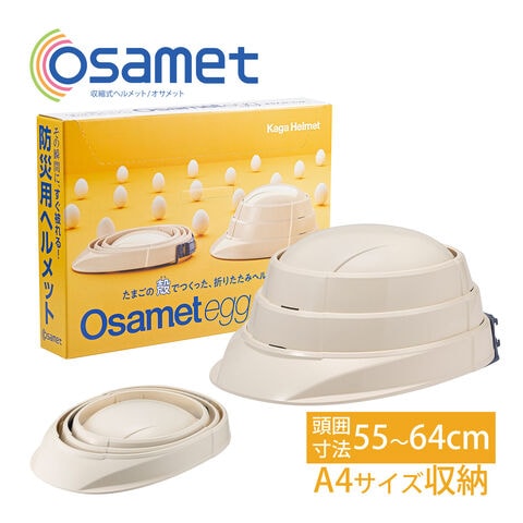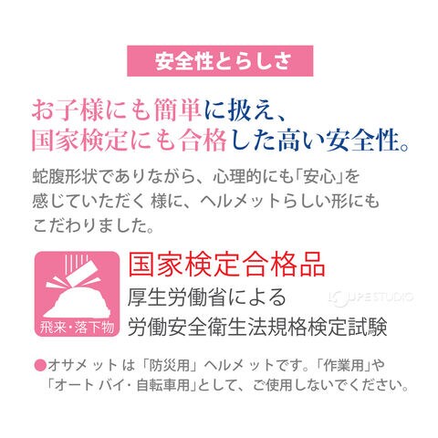 | 注意 | 飛来・落下物国家検定合格品。オサメットは「防災用」ヘルメットです。「作業用」や「オートバイ・自転車用」として、ご使用しないでください。オサメット・エッグには頭頂部のロック機能はありませんが、安全性に問題なくお使いいただけます。 |