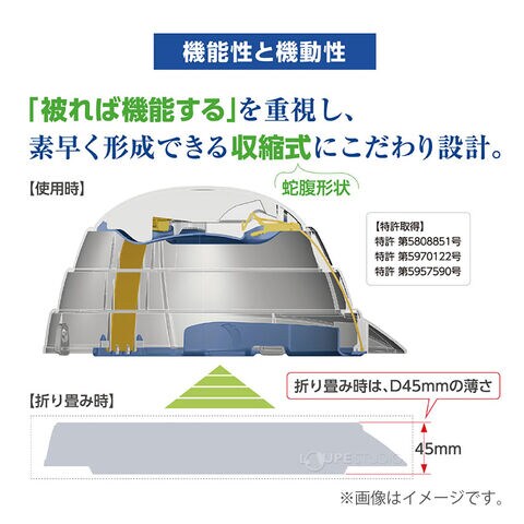 - 蛇腹式構造により、万が一の際には素早く展開して頭部をしっかり保護します。