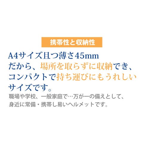 - A4サイズ・厚さわずか45mmのコンパクト設計で、収納場所を取らず持ち運びにも便利な防災用折りたたみヘルメットです。