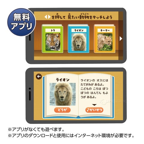 • また、読み上げ付きのどうぶつずかんアプリがセットになっており、動物の解説文を聞いたり、写真を見たりして理解を深められます。
