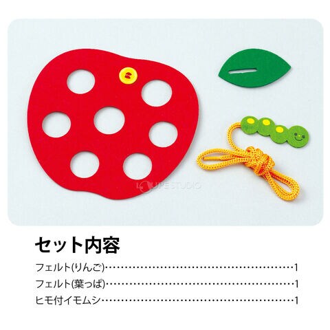 | セット内容 | フェルト(りんご)×1、フェルト(葉っぱ)×1、ヒモ付イモムシ×1 |