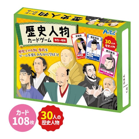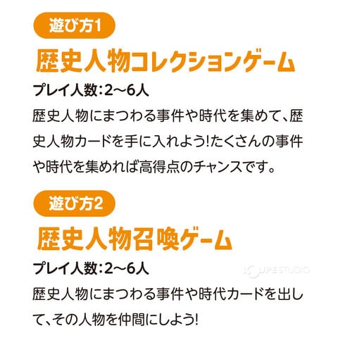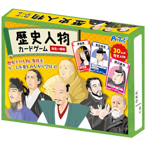 - 歴史上の人物・事件・時代カードを使って遊ぶことで、楽しく歴史を学べるカードゲームです。