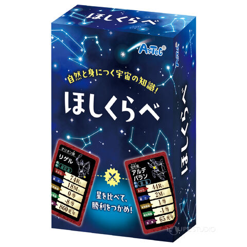 - 星の「大きさ」「重さ」「明るさ」「距離」などを比べて遊ぶ、宇宙テーマのカードゲームです。