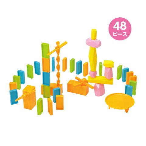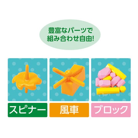 セット内容ドミノ牌(オレンジ)×9、ドミノ牌(ブルー)×9、ドミノ牌(グリーン)×9、ブロック×10、スピナー台×1、スピナー×1、風車台×3、風車A×2、風車ピン×2、風車B×1、風車棒×1