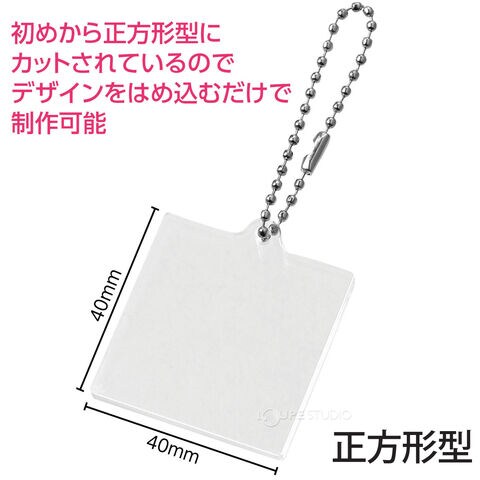 初めから正方形型にカットされており、デザインをはめ込むだけでオリジナルのキーホルダーがつくれます。