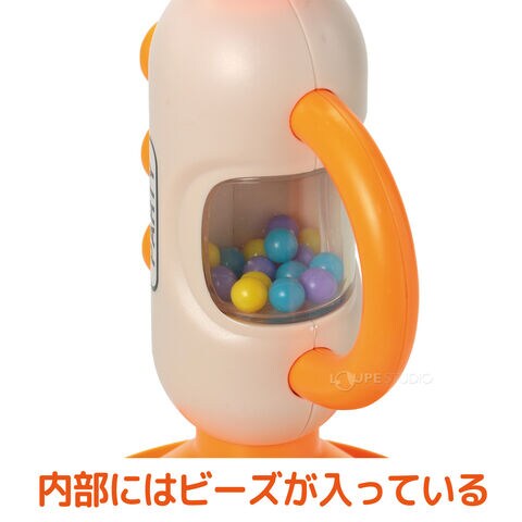 - 吹くとプップーとかわいい音が鳴り、内部にはビーズが入っているので、本体を振るとガラガラとした楽しい音も楽しめます。