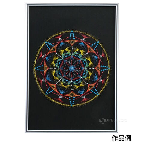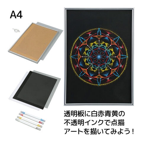 | セット内容 | メタリックフレーム(A4/297×210mm×1)、画紙用透明板(A4/297×210×0.2mm、×1)、黒画用紙(A4/297×210mm)×1、ドットマーカーペン赤、青、黄、白×各1 |