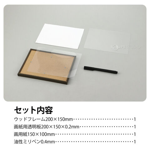 | セット内容 | ウッドフレーム200×150mm×1、画紙用透明板200×150×0.2mm×1、画用紙150×100mm×1、油性ミリペン0.4mm×1 |