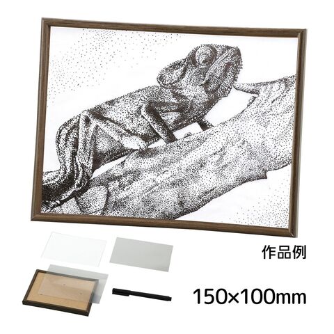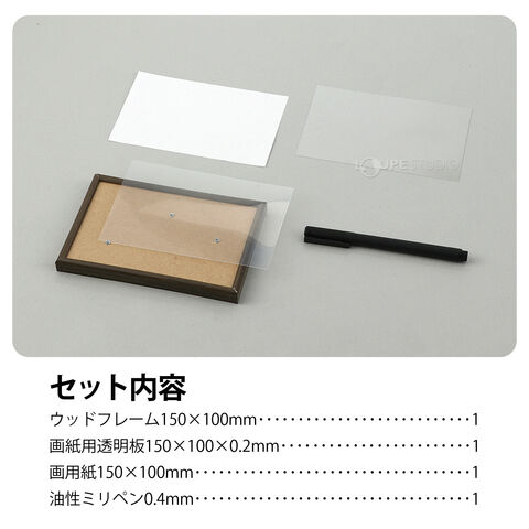 | セット内容 | ウッドフレーム150×100mm×1、画紙用透明板150×100×0.2mm×1、画用紙150×100mm×1、油性ミリペン0.4mm×1 |