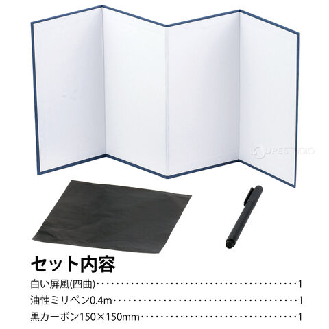| セット内容 | 白い屏風(四曲)×1、油性ミリペン0.4m×1、黒カーボン150×150mm×1 |