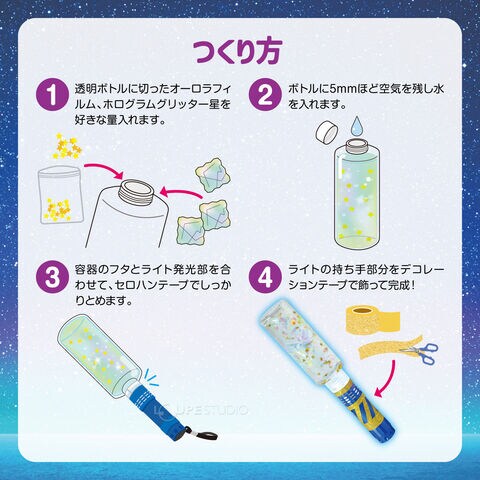 | 材質 | 透明プラスチックボトル/PET、ライト/アルミ合金・PP・ポリカーボネート・ゴム・スチール、オーロラフィルム/ポリエステル、ホログラムグリッター星/PET、デコレーションテープ/PVC |