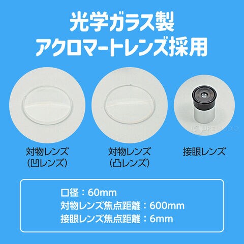 | 商品サイズ | 完成サイズ/約600×110×70mm、口径/60mm、接眼レンズ焦点距離/6mm、対物レンズ焦点距離/600mm |