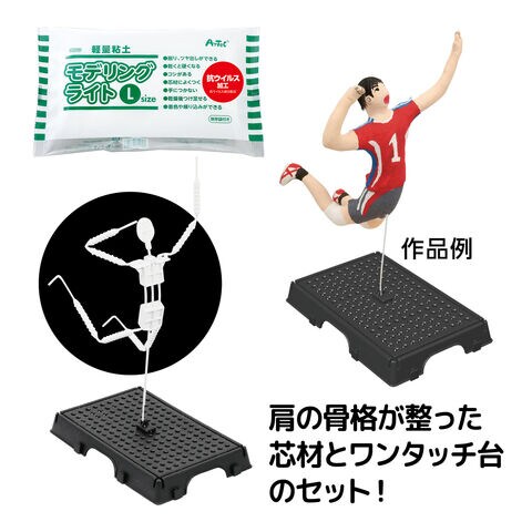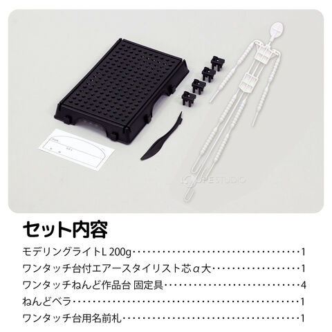 | セット内容 | モデリングライトL200g250×140×13mm、ワンタッチ台付エアースタイリスト芯α大 330×75×12mm、 ワンタッチねんど作品台(207×137×25mm)固定具×4、ねんどベラ×1、ワンタッチ台用名前札×1) |