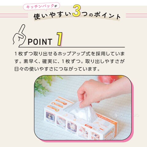 • エンボス加工で袋が開きやすく、1枚ずつ取り出せて使いやすい設計です。