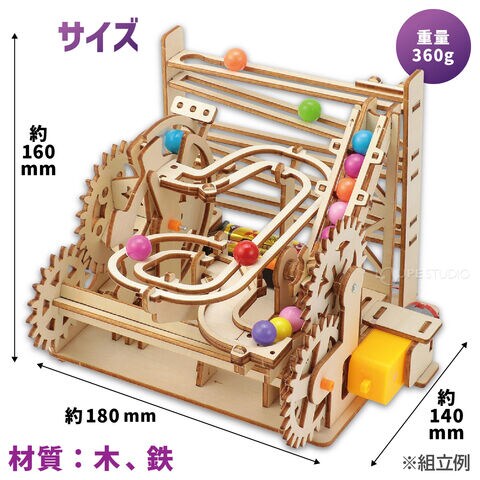 - 歯車とモーターの力で動力が伝わり、カラフルなボールがエレベーターで持ち上げられ、傾斜レールやカーブ、急降下コースを走り抜けながら何度も循環します。