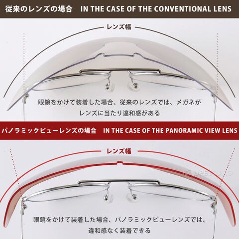 レンズがこめかみから回り込む設計のため、薄型のメガネはもちろん。左右150mm・高さ50mmの大型メガネまでゴーグルに納まり、圧迫感のない快適なフィット感を得ることができます。