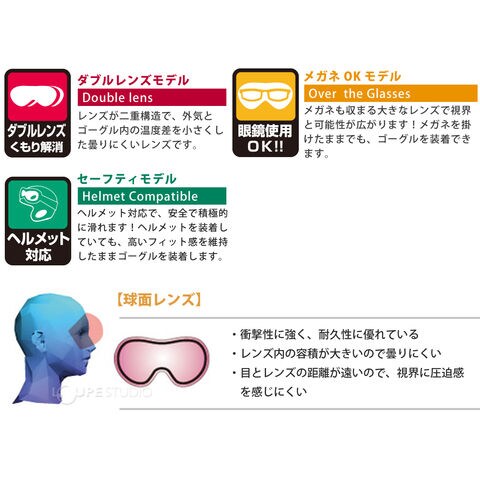 | その他 | ヘルメット対応、メガネ対応、ダブルレンズ |