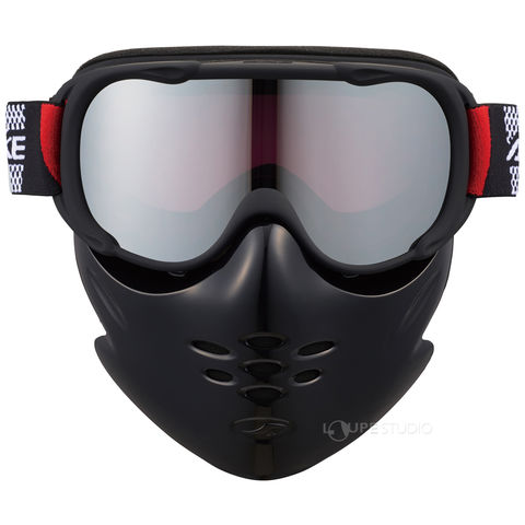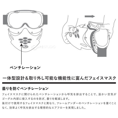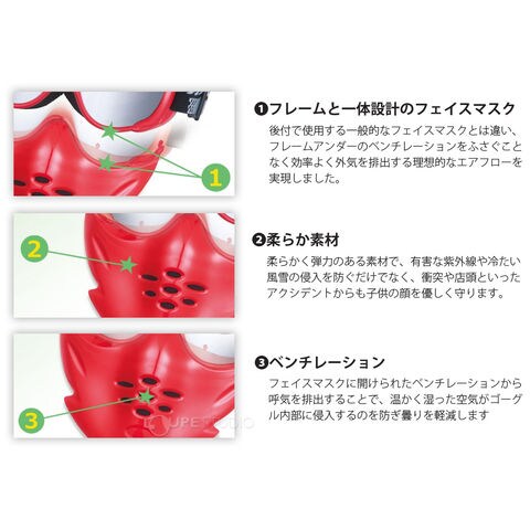 安全性を最優先に考えて開発されたフェイスマスク付きゴーグル。軟質素材のフェイスマスクが紫外線や冷たい風雪をブロックし、転倒や衝突としったアクシデントから守ります。