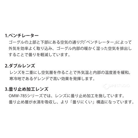 | レンズカラー | OMW-785LP RE/レッドミラー(偏光+ピンクベース) OMW-785LP GR/グリーンミラー(偏光+ピンクベース) |