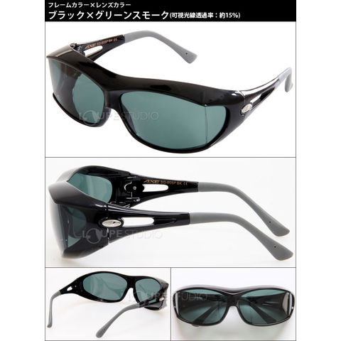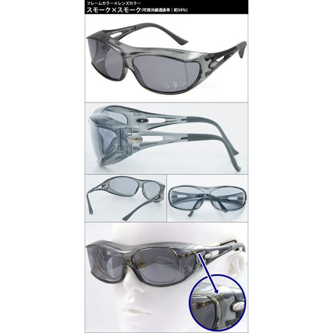 | 品番:フレーム×レンズ(可視光線透過率、偏光度) | SG-605P-SM:スモーク×スモーク(可視光線透過:約34%、偏光度:99.70%) SG-605P-DSM:スモーク×ダークスモーク(可視光線透過:約17%、偏光度:99.94%) SG-605P-BK:ブラック×スモーク(可視光線透過:約34%、偏光度:99.70%) SG-605P-DBK:ブラック×ダークスモーク(可視光線透過:約17%、偏光度:99.94%) SG-605P-BK-GRN:ブラック×グリーンスモーク(可視光線透過:約15%、偏光度:99.93%) |