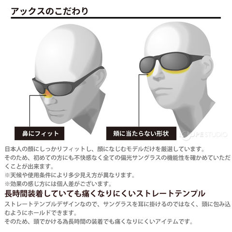 偏光サングラスのエントリーモデル。ハードスタイルデザインで特にサイクルスポーツにおすすめ。フレーム下部の両サイドのエアーインテークから空気を取り込めるので曇りにくい。またレジャー、スポーツ、ドライブにも最適。