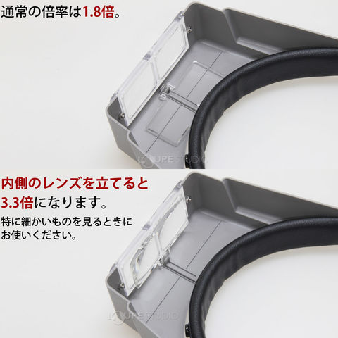 通常の倍率は1.8倍。内側のレンズを立てると3.3倍になります。特に細かいものを見るときにお使いください。