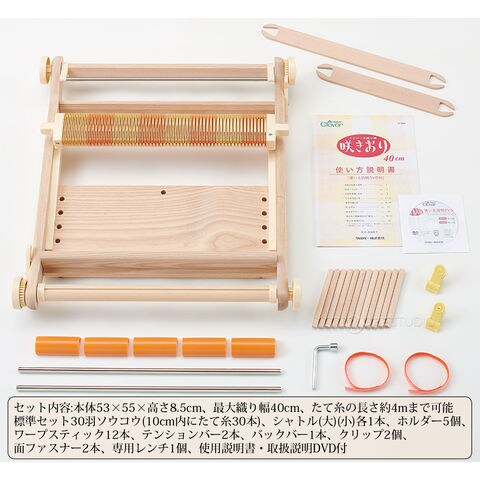 | 商品サイズ | 本体53×55×高さ8.5cm 最大織り幅40cm たて糸の長さ約4mまで可能 標準セット30羽ソウコウ(10cm内にたて糸30本)、シャトル〈大〉〈小〉各1本 ホルダー5個、ワープスティック12本 テンションバー2本、クリップ2個 使用説明書・取扱説明DVD付 |