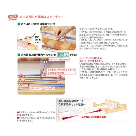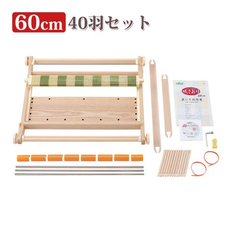 | 商品サイズ・容量 | 本体565×732×85mm 最大織り幅60cm たて糸の長さ約4.9mまで可能 標準セット40羽ソウコウ〈60cm〉1本、シャトル〈大〉〈特大〉各1本 ホルダー6個、ホルダー〈短〉2個 ワープスティック〈長〉12本、テンションバー3本 クリップ1個、面ファスナー2本 専用レンチ1個 使用説明書・取扱説明DVD付 |