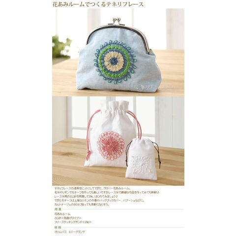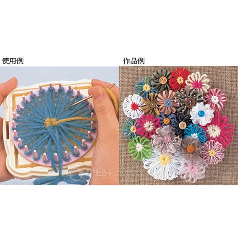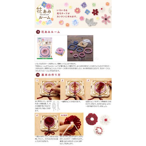 いろんなフラワーモチーフがきれいに、簡単につくることができます。ピンリング(枠)に糸をかけてかがるだけで、誰でもすぐにモチーフづくりが始められます。枠のカタチや組み合わせ、糸のかけ方やかがり方でバリエーション豊かな作品づくりが楽しめます。おしゃれなラッピングに。コサージュとしてアクセントに。