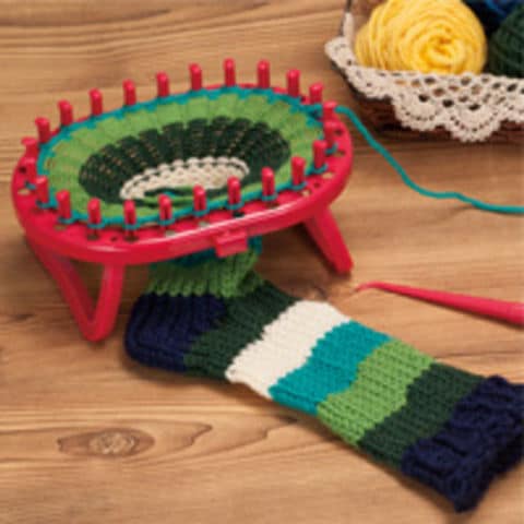 - 楽な姿勢で編めるスタンド付きだから、ボーダーソックスもすいすい作れます。
