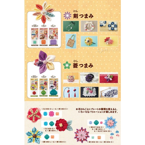 - 「つまみ細工プレート」は、順番どおりに縫って糸を引きしめるだけで、かんたんにつまみ細工風の花びらが作れるプレートです。大きめサイズなので作りやすく、短時間で華やかなモチーフが完成します。花びらを1枚ずつ作るので、枚数や色を変えて楽しめます!