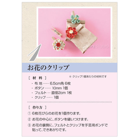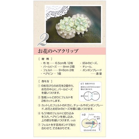 • できあがりサイズは〈SS〉(直径)約3.5cm。髪飾りやアクセサリーにぴったりな大きさです。6作品が作れるアイデアレシピブック付です!