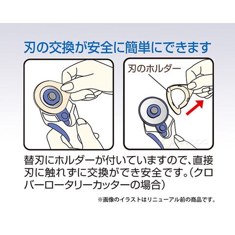 クロバーロータリーカッター、クロバースラッシュカッターの専用替刃。クロバーロータリーカッターの刃の交換が安全に簡単にできます替刃にホルダーが付いていますので、直接刃に触れずに交換ができ安全です。(クロバーロータリーカッターの場合)