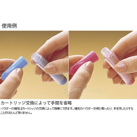 | 素材 | 粉/タルク、顔料(ブルー、イエロー、ピンク) 本体/ABS樹脂 キャップ/PE樹脂 |