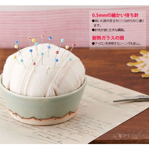 可愛くて、高品質! 耐熱ガラスの頭でアイロンも安心です。0.5mm の細い待針なので抜いた跡が目立ちにくく、なめらかに通ります。針先が鋭く丈夫な鋼製です。可愛い紙製のケース付きで携帯に便利です!