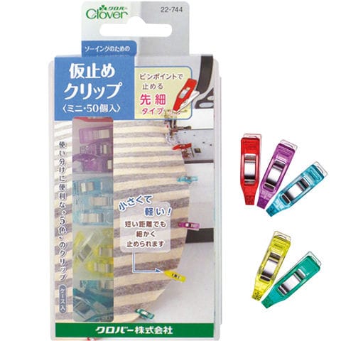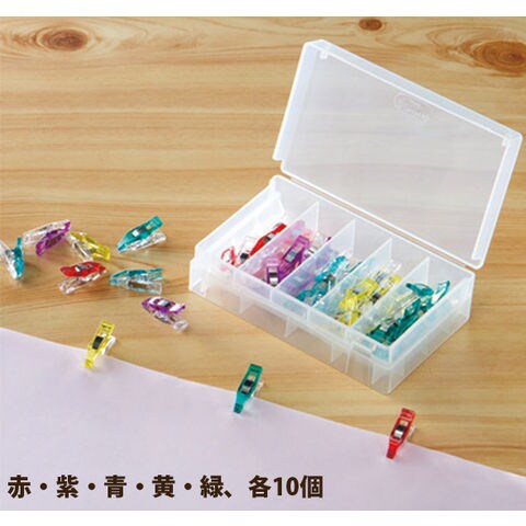 仮止めクリップ ミニ 50個入(赤・紫・青・黄・緑、各10個) 便利なケース付 クロバー 裁縫仮止めクリップ 手芸仮止めクリップ clover 仮止めクリップ