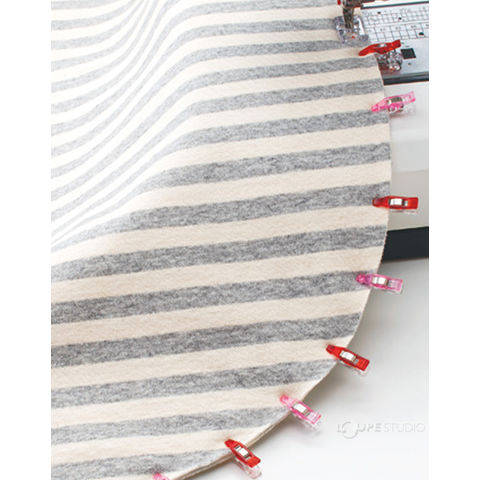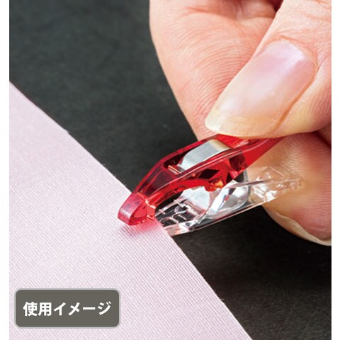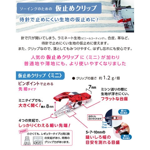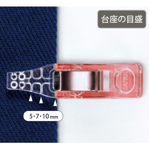 普通地・薄地もピンポイントではさめる「ミニ」タイプは、曲線の仮止めにも活躍します。小さくて軽く、短い距離の仮止めにも便利。開口部は、最大8mmと大きく開きます。4つの突起があり、細い先端でもしっかりくわえます。 5・7・10mmの縫いしろ幅の目安を測れる目盛付!ニット地のロックミシンソーイングに最適です。